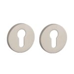 Nikkelen cilinderplaatjes uit de Comfort collectie van Aprile. Deze cilinderrozetten staan op ronde rozetten van Ø53 mm met een dikte van 7 mm en zijn voorzien van nokken waardoor ze beter blijven zitten. Deze Aprile cilinderrozetten zijn geschikt voor binnendeuren met een deurdikte tot 44 mm en worden per paar geleverd inclusief metalen onderrozetten en bevestigingsmaterialen. Voor bredere deuren kunnen we langere bevestigingsmaterialen meeleveren.