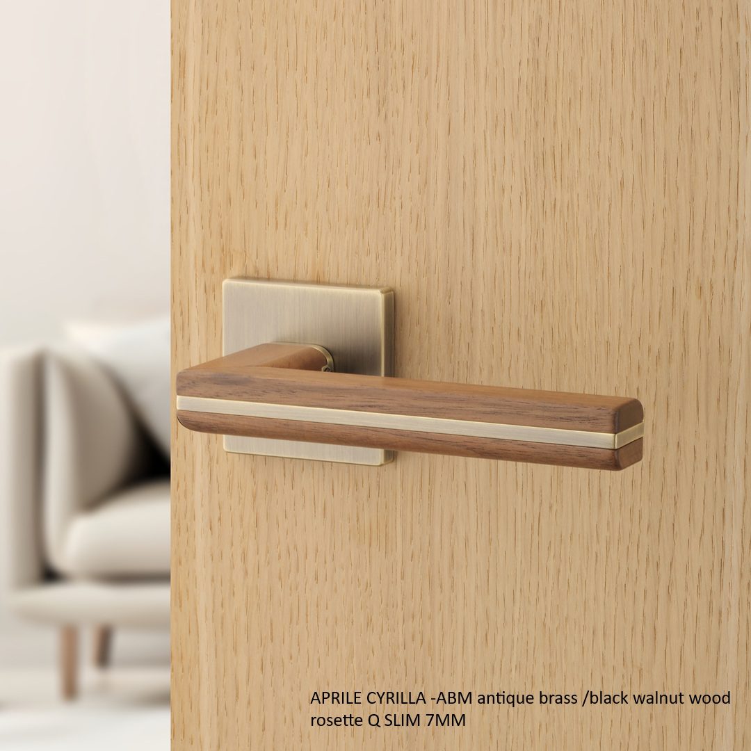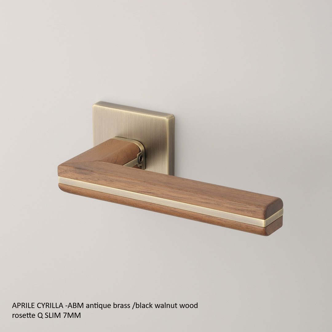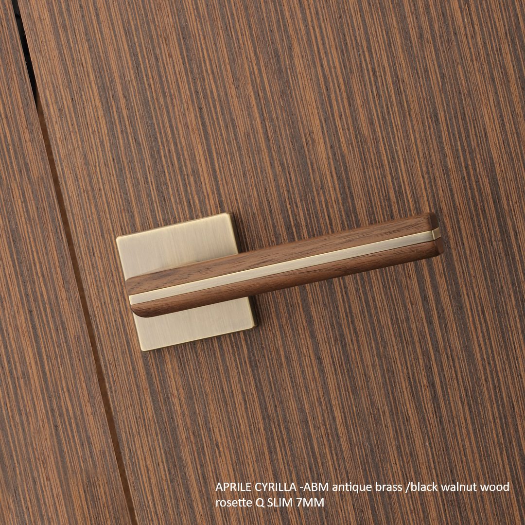 Aprile Deurklink Cyrilla Q Slim 7 mm is een massieve designdeurkruk met een luxueuze mix van zwart walnoothout en antiek messing (ABM). De warme houten greep contrasteert mooi met de karaktervolle messinglook, terwijl het vierkante Q-rozet het geheel strak en architecturaal houdt.