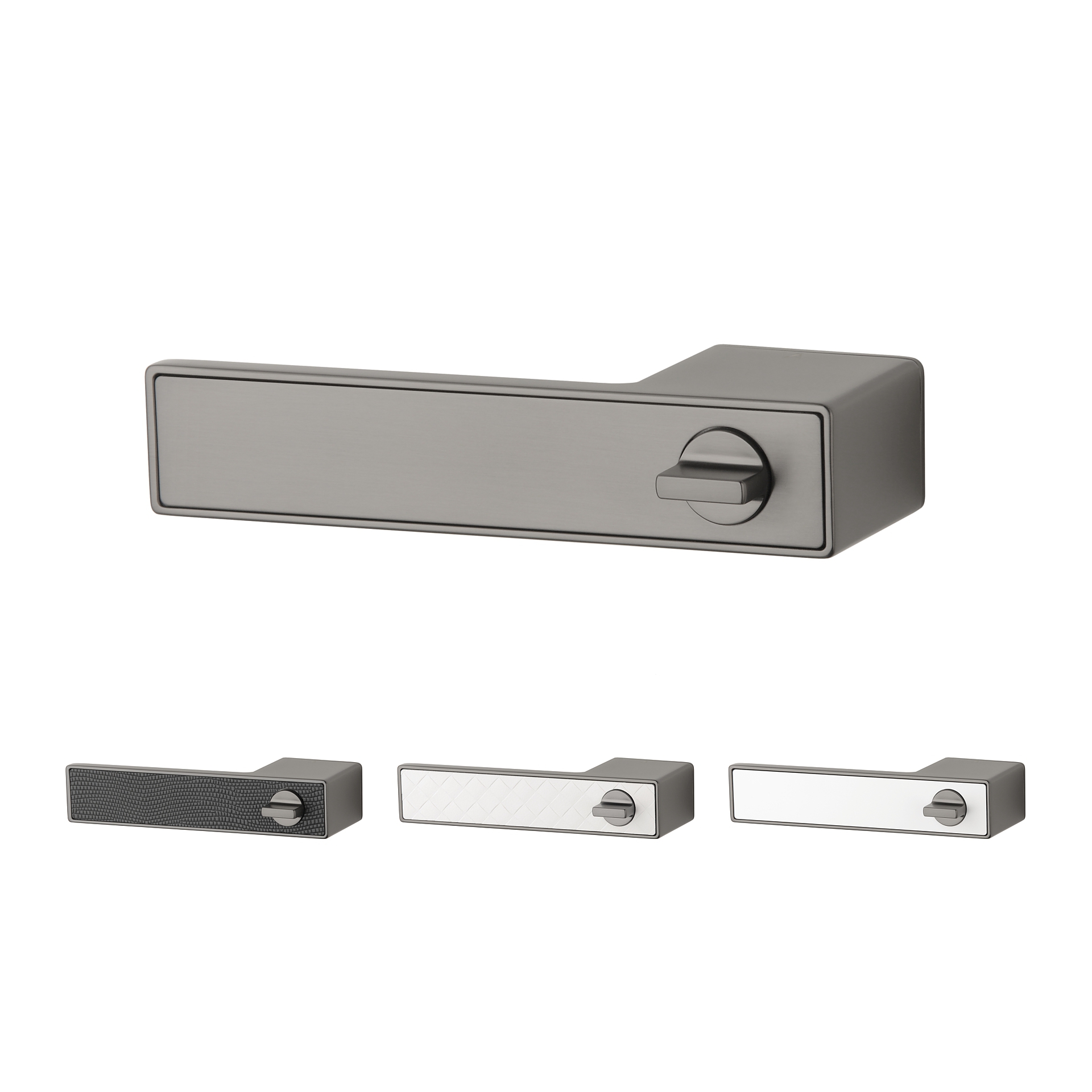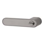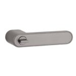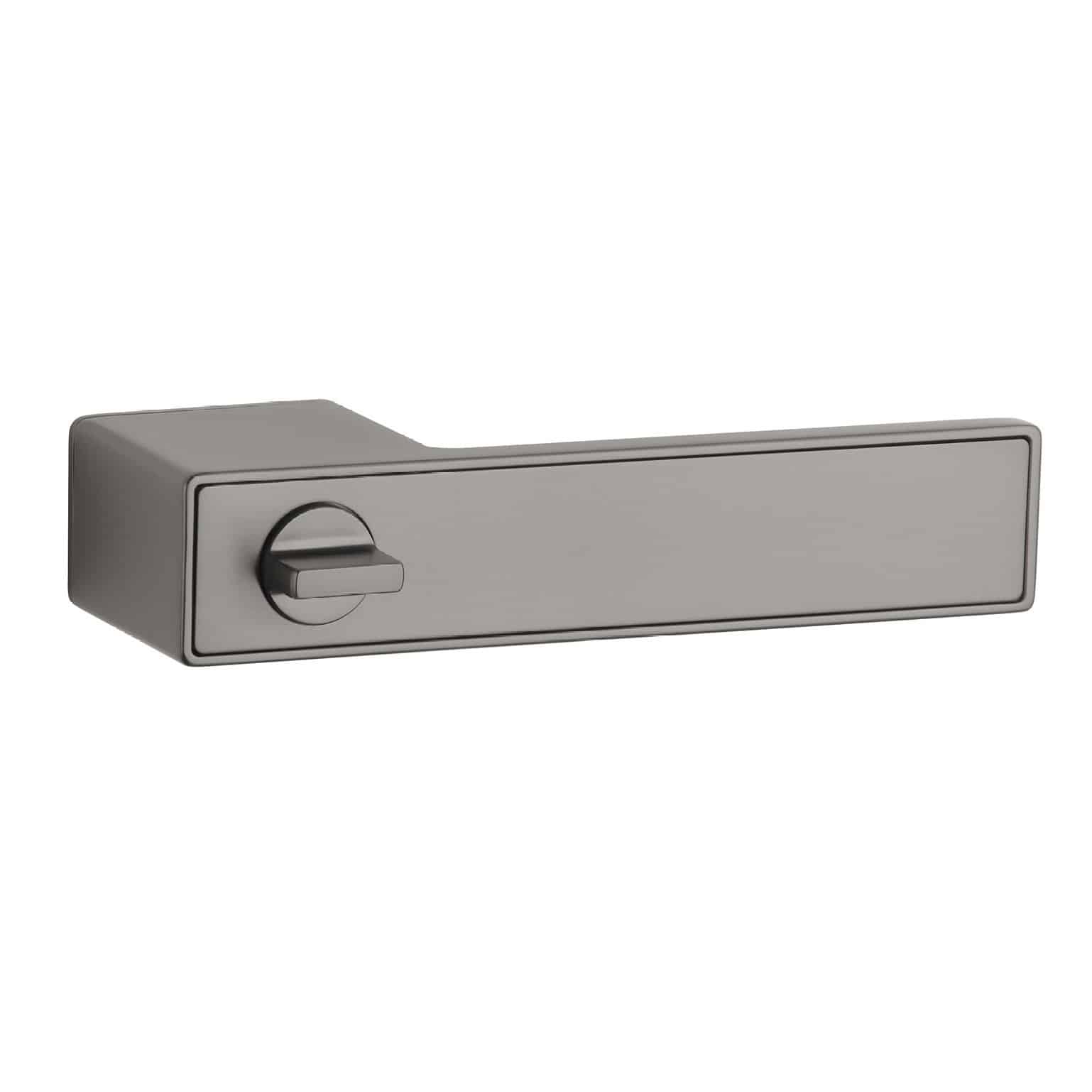 Opvallend bij dit model is de WC versie waarbij het draaiknopje verwerkt is in de deurklink. Je hebt hiervoor dus geen extra WC garnituur nodig. De grafiet kleurige design deurklinken staan op rechthoekige rozetten van 49x34x2,5mm welke gelijk lopen met de deurklinken. Hierdoor lijkt het dat de onderrozetten verborgen of onzichtbaar zijn.