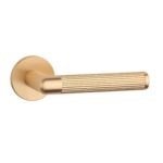 Deze massieve deurklinken ‘Lobelia’ in mat goud behoren tot de Prestige collectie van Aprile. Deze deurklinken staan op ronde rozetten van Ø 52 mm met een dikte van slechts 5 mm. Het geslepen patroon op de greep gecombineerd met de dunne rozetten geven deze klinken een schitterende uitstraling waardoor ze zeker in de Prestige collectie thuis horen. De deurklinken worden per paar geleverd inclusief kunststof onderrozetten, vierkantstift 8×8 mm en bevestigingsmaterialen. Deze mat gouden design deurklinken, geschikt voor binnendeuren met een deurdikte tot 44 mm, zijn geveerd en voorzien van nokken waardoor ze beter blijven zitten. Voor bredere deuren kunnen we langere bevestigingsmaterialen meeleveren.