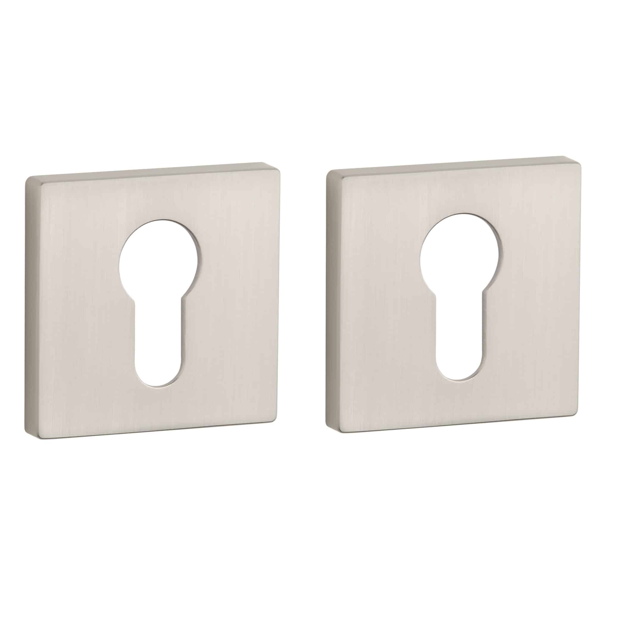 Vierkant cilinderplaatjes uit de Premium collectie van Aprile in mat nikkelen uitvoering. Deze cilinderrozetten staan op vierkant rozetten van 52×52 mm met een dikte van 7 mm en zijn voorzien van nokken waardoor ze beter blijven zitten. Deze Aprile cilinderrozetten zijn geschikt voor binnendeuren met een deurdikte tot 44 mm en worden per paar geleverd inclusief kunststof onderrozetten en bevestigingsmaterialen. Voor bredere deuren kunnen we langere bevestigingsmaterialen meeleveren.