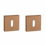 Vierkante sleutelplaatjes uit de Premium collectie van Aprile in mat koperen PVD uitvoering. Deze mat koperen sleutelrozetten staan op vierkant rozetten van 52×52 mm met een dikte van 7 mm en zijn voorzien van nokken waardoor ze beter blijven zitten. Deze Aprile sleutelrozetten zijn geschikt voor binnendeuren met een deurdikte tot 44 mm en worden per paar geleverd inclusief metalen onderrozetten en bevestigingsmaterialen. Voor bredere deuren kunnen we langere bevestigingsmaterialen meeleveren.