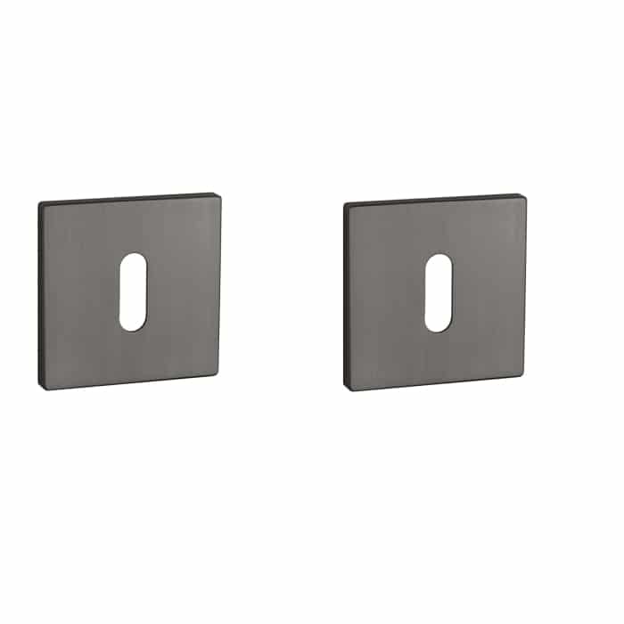 Sleutelplaatjes uit de Prestige collectie van Aprile in mat antraciet. Deze sleutelrozetten in mat antraciet staan op vierkant rozetten van 52×52 mm met een dikte van 5 mm en zijn voorzien van nokken waardoor ze beter blijven zitten. De eigentijdse extra dunne rozetten zorgen voor een strakke uitstraling. Deze Aprile sleutelrozetten zijn geschikt voor binnendeuren met een deurdikte tot 44 mm en worden per paar geleverd inclusief kunststof onderrozetten en bevestigingsmaterialen. Voor bredere deuren kunnen we langere bevestigingsmaterialen meeleveren.