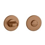 Mat koperen WC garnituur uit de Prestige collectie van Aprile. Dit mat koperen WC garnituur staat op ronde rozetten van Ø52 mm met een dikte van 5 mm die zijn voorzien van nokken waardoor ze beter blijven zitten. De extra dunne rozetten zorgen voor een strakke eigentijdse uitstraling.