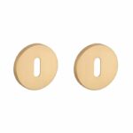 Goud satiné sleutelplaatjes uit de Comfort collectie van Aprile. Deze sleutelrozetten staan op ronde rozetten van Ø53 mm met een dikte van 7 mm en zijn voorzien van nokken waardoor ze beter blijven zitten. Deze Aprile sleutelrozetten zijn geschikt voor binnendeuren met een deurdikte tot 44 mm en worden per paar geleverd inclusief metalen onderrozetten en bevestigingsmaterialen. Voor bredere deuren kunnen we langere bevestigingsmaterialen meeleveren.