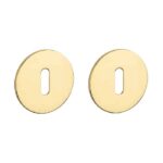 Paar ultra dunne sleutelrozetten met slechts een dikte van 3mm. De gouden sleutelplaatjes hebben een diameter van 54,5 mm en zijn voorzien van een goud gepolijste PVD-coating. De onderrozetten (1 zijde magnetisch) worden door en door bevestigd met de meegeleverde M4 patentvijzen en zijn voorzien van nokken voor een stevige bevestiging. Deze ronde rozetten passen dankzij het universele design in ieder interieur en zijn geschikt voor binnendeuren met een deurdikte tot 43 mm. Voor bredere deuren kunnen we langere bevestigingsmaterialen meeleveren.