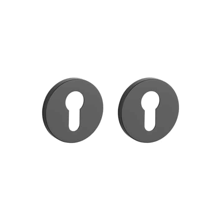 Mat zwarte cilinderrozetten uit de Stile collectie. Deze zwarte cilinderplaatjes met metalen onderrozetten zijn rond 53 mm met een dikte van 7 mm en voorzien van nokken waardoor ze beter blijven zitten. De Stile cilinderrozetten zijn geschikt voor binnendeuren met een deurdikte tot 44 mm en worden per paar geleverd inclusief metalen onderrozetten en bevestigingsmaterialen voor doorlopende bevestiging. Voor bredere deuren kunnen we langere bevestigingsmaterialen meeleveren.